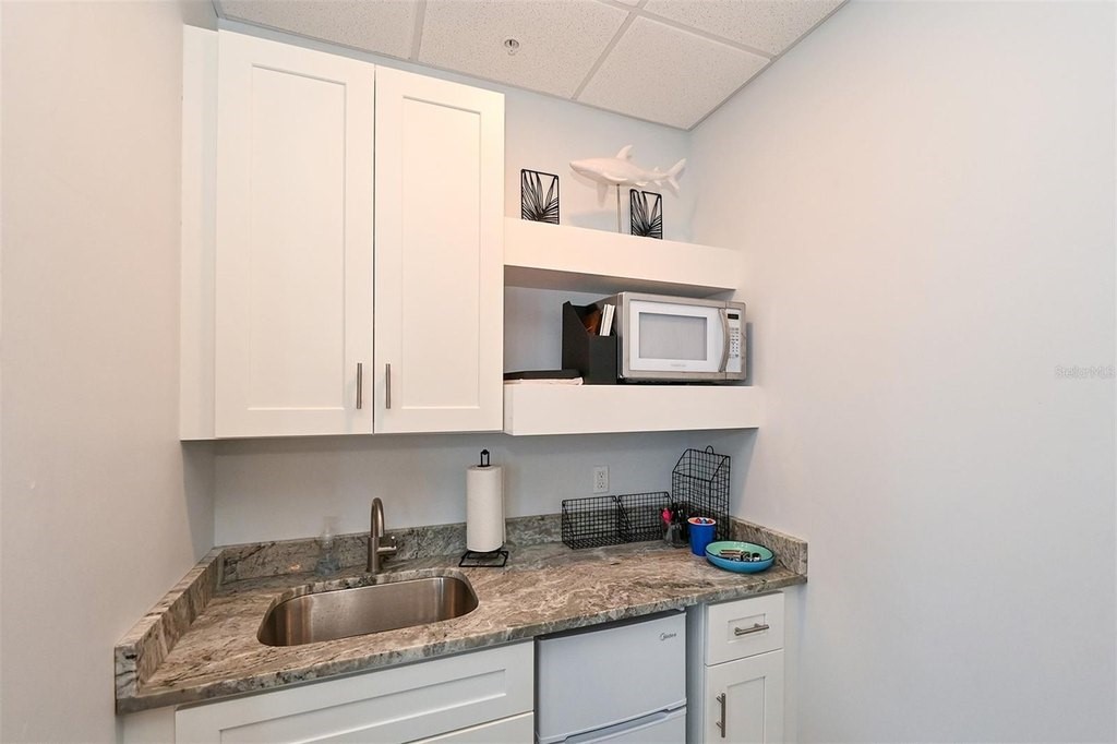 LIVE-WORK-PLAY! This unique condo is ready to go. Penthouse style 1-2BR/1.5BA is beautifully finished. Wood cabinets with pull outs in the kitchen with Granite counters. Very open floor plan with luxury vinyl throughout. Tankless water heater, main bath offers a huge walk-in shower, undercabinet lighting, dual sinks, toilet with bidet. Presently the office area (2nd Bedroom) has a separate door with kitchenette and its own bathroom. This is zoned residential/commercial, so no more driving to work. Views of Shakett Creek, 2 pets allowed any size. The complex is located on the water and offers elevators, a heated pool/spa, exercise room, conference room, 2 assigned parking but use of 9 parking spaces. This can be combined with the unit downstairs (same zoning) for a Total of 4, 990 square feet. Seeing is believing.